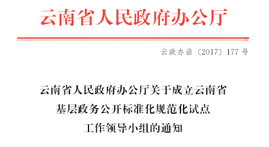 云南省人民政府办公厅关于成立云南省基层政务公开标准化规范化试点工作领导小组的...2017-10-11